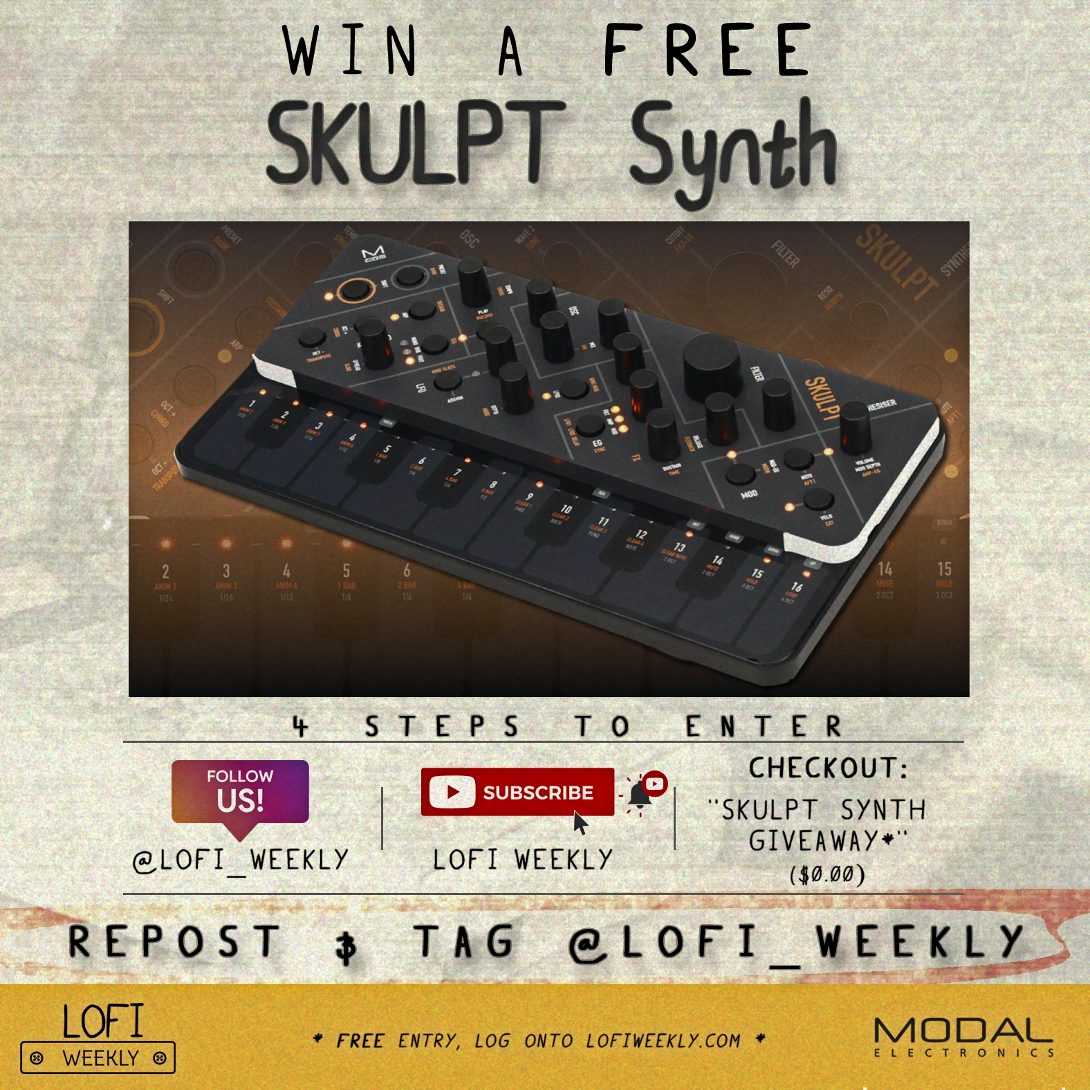 We?re giving away a Skulpt Synthesizer by Modal Electronics! To enter, simply follow four easy steps: follow both @lofi_weekly and @modalelectronics on Instagram (with notifications on), subscribe to LoFi Weekly on YouTube, check out with the giveaway product (it?s free), and repost the giveaway image while tagging @lofi_weekly. Entries close June 13 at midnight PT, and the winner will be randomly selected and announced on June 20 at 11 AM EST. U.S. shipping is free, while international winners will receive a $20 shipping credit. Good luck!